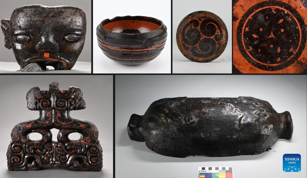 This combo picture shows lacquerwares unearthed from the Wuwangdun tomb discovered in Huainan, east China's Anhui Province. (Anhui provincial cultural relics and archaeology research institute/Handout via Xinhua)