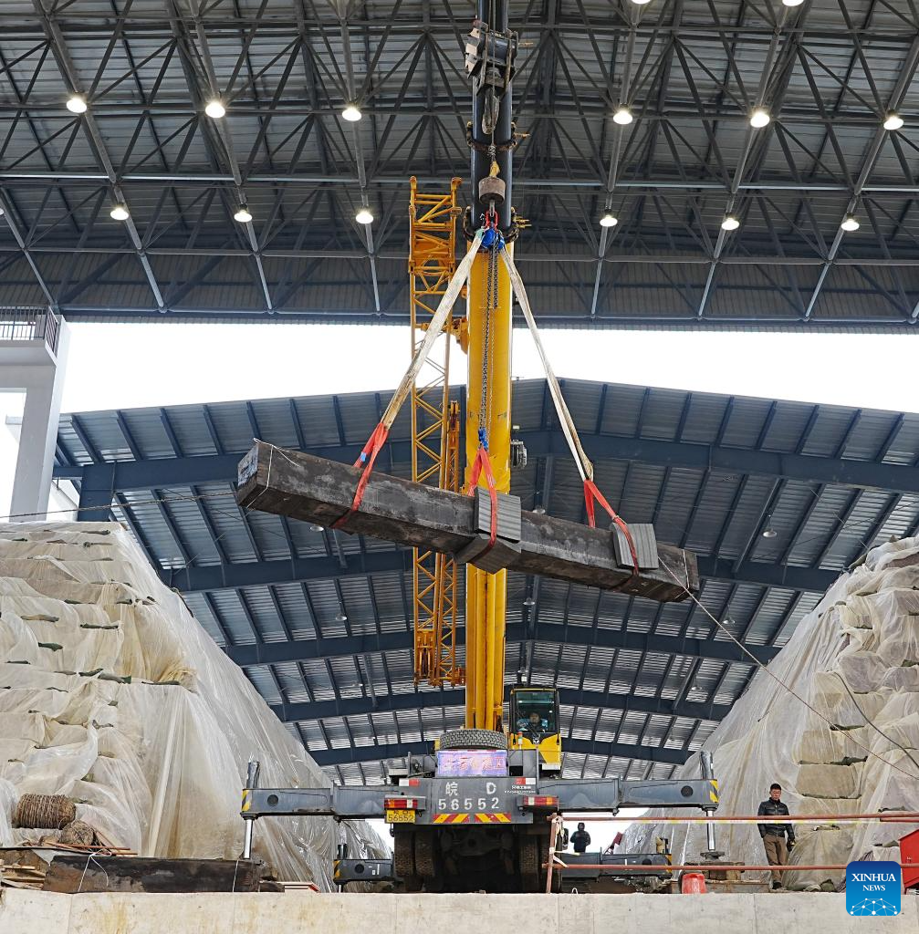 Staff members operate a crane to lift a outer coffin slab of the Wuwangdun tomb discovered in Huainan, east China's Anhui Province, April 14, 2024. (National Cultural Heritage Administration/Handout via Xinhua)