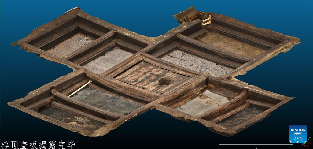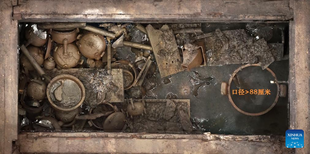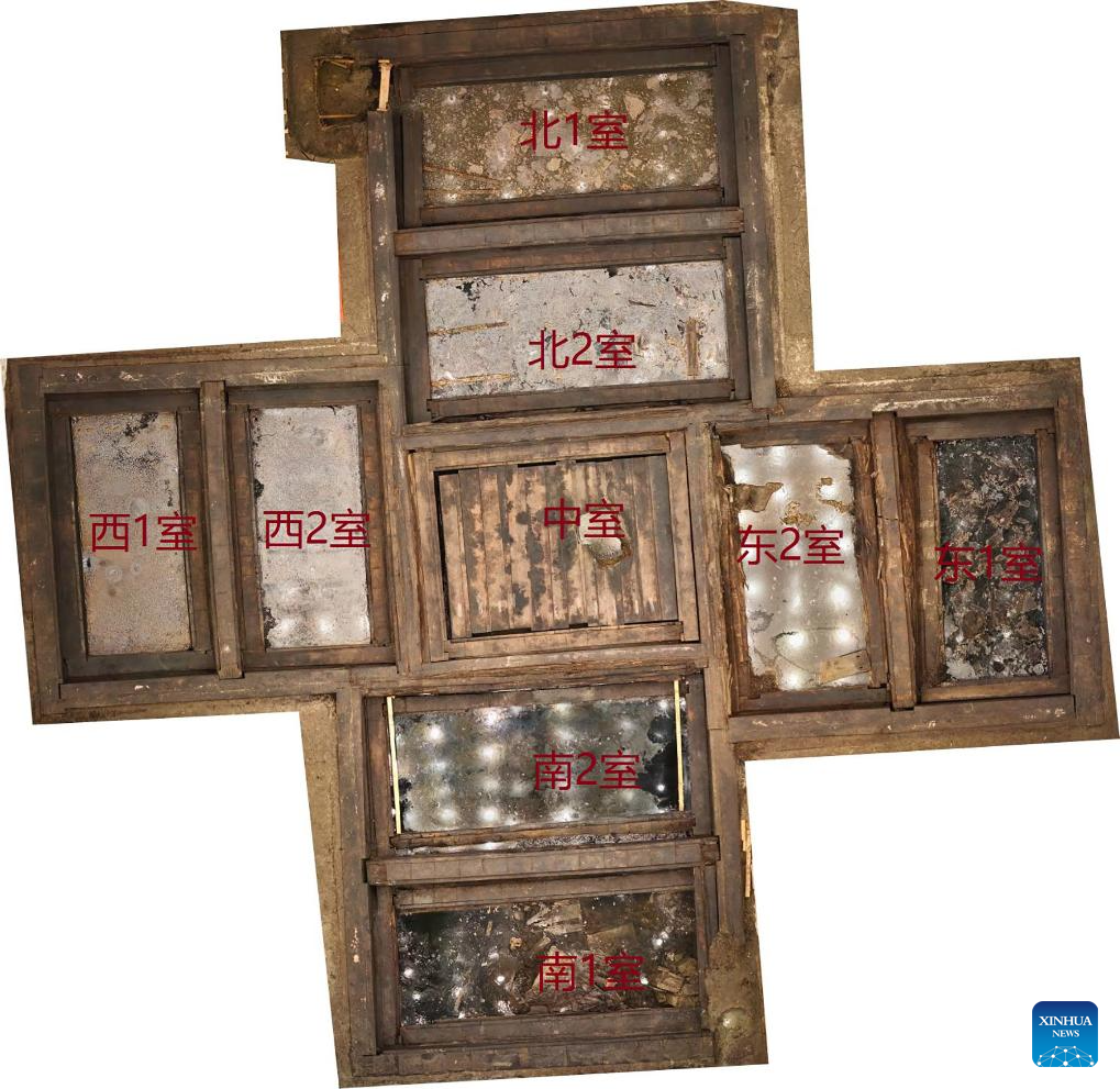 This picture shows the layout of outer coffin at the main tomb after slabs were removed in the Wuwangdun tomb discovered in Huainan, east China's Anhui Province. (Anhui provincial cultural relics and archaeology research institute/Handout via Xinhua)