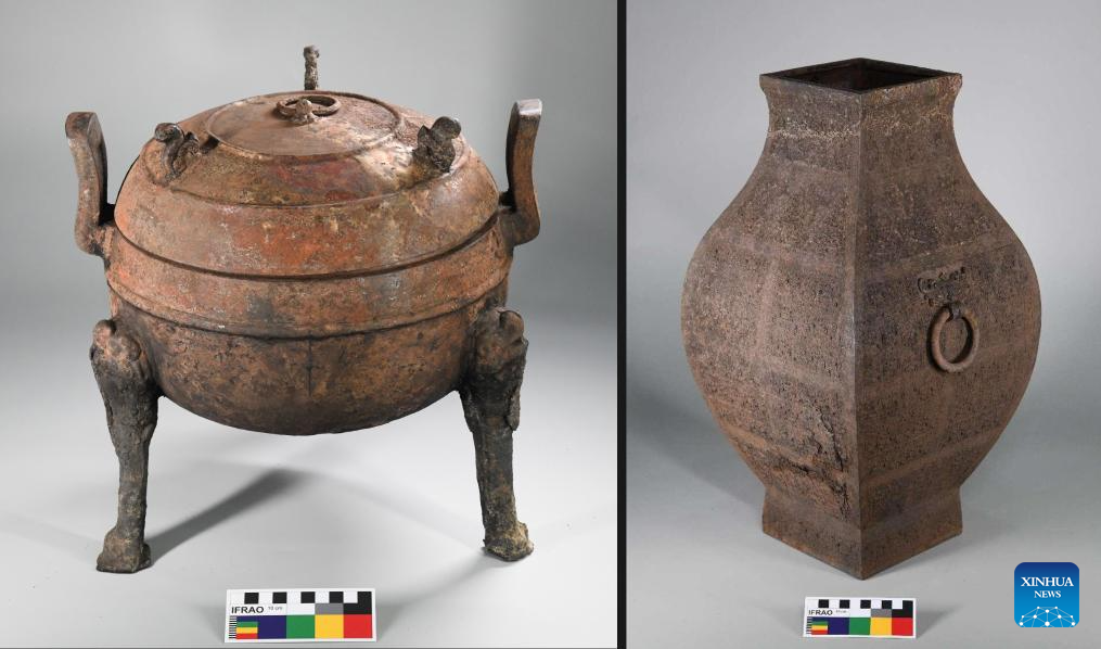This combo picture shows bronzewares unearthed from the Wuwangdun tomb discovered in Huainan, east China's Anhui Province. (Anhui provincial cultural relics and archaeology research institute/Handout via Xinhua)