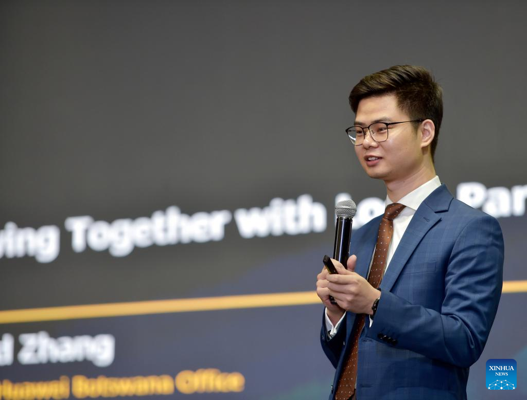 David Zhang, managing director of Huawei Technologies Botswana, speaks at the Huawei Telecom Congress 2024 in Gaborone, Botswana, on April 16, 2024. Authorities in Botswana have renewed their emphasis on the pivotal role of information, technology, and learning in driving economic success, and have called for cooperation among stakeholders. (Photo by Tshekiso Tebalo/Xinhua)