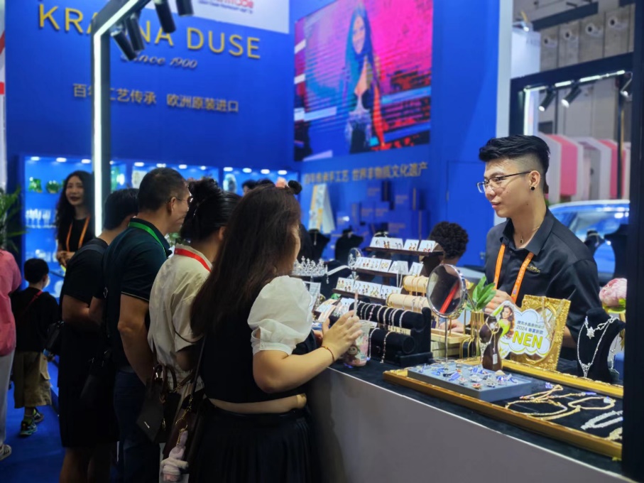 Crystal jewelry on display in the exhibition area of the Czech Republic catch the visitors’ attention, prompting them to try on the pieces. (People's Daily Online/Huang Sheng)