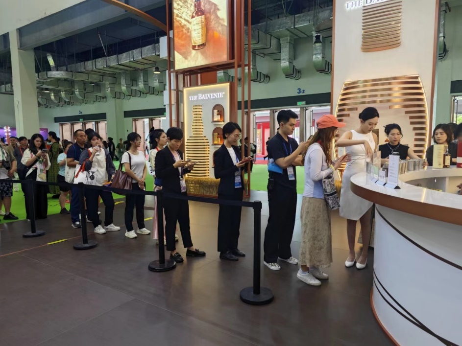 Visitors fall in line to have a taste of wine at a booth of imported wine. (People's Daily Online/Huang Sheng)