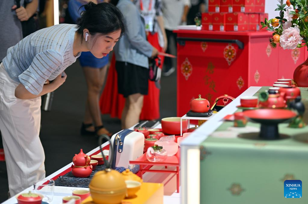Visitors looks at Edenus tea set displayed at the fourth China International Consumer Products Expo in Haikou, capital city of south China's Hainan Province, April 17, 2024. The fourth China International Consumer Products Expo, which lasts from April 13 to 18, is China's only national-level exhibition featuring consumer products and is also the largest consumer expo in the entire Asia-Pacific region. (Xinhua/Guo Cheng)