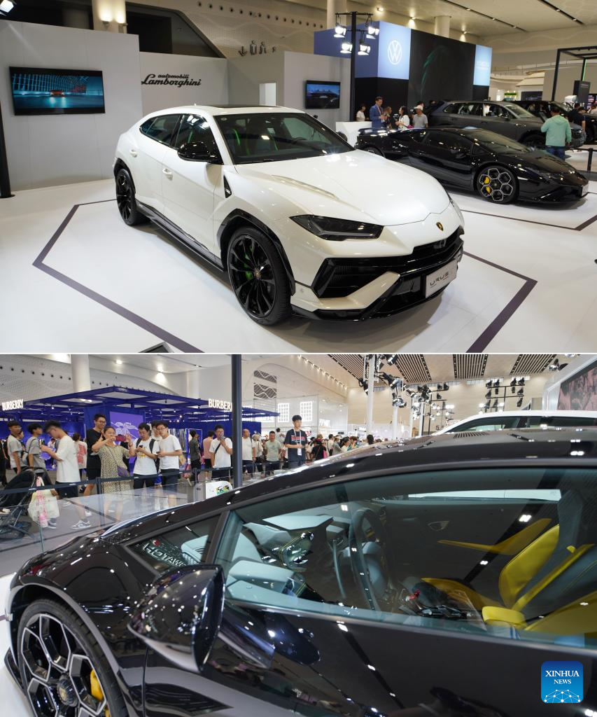 This combo photo shows visitors looking at Lamborghini vehicles displayed during the fourth China International Consumer Products Expo in Haikou, capital city of south China's Hainan Province, April 17, 2024. The fourth China International Consumer Products Expo, which lasts from April 13 to 18, is China's only national-level exhibition featuring consumer products and is also the largest consumer expo in the entire Asia-Pacific region. (Xinhua/Li Mengjiao)