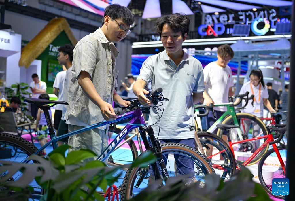 Visitors try the bicycles at the booth of Taishan Sports Industry Group Co., Ltd. during the fourth China International Consumer Products Expo in Haikou, capital city of south China's Hainan Province, April 17, 2024. The fourth China International Consumer Products Expo, which lasts from April 13 to 18, is China's only national-level exhibition featuring consumer products and is also the largest consumer expo in the entire Asia-Pacific region. (Xinhua/Guo Cheng)