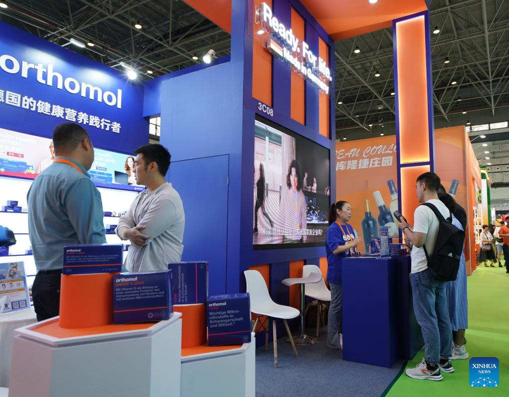 Exhibitors and visitors talk at the booth of Orthomol during the fourth China International Consumer Products Expo in Haikou, capital city of south China's Hainan Province, April 17, 2024. The fourth China International Consumer Products Expo, which lasts from April 13 to 18, is China's only national-level exhibition featuring consumer products and is also the largest consumer expo in the entire Asia-Pacific region. (Xinhua/Li Mengjiao)