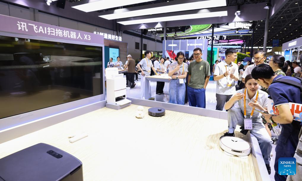 Visitors look at iFlytek's AI-powered sweeping and mopping robot during the fourth China International Consumer Products Expo in Haikou, capital city of south China's Hainan Province, April 17, 2024. The fourth China International Consumer Products Expo, which lasts from April 13 to 18, is China's only national-level exhibition featuring consumer products and is also the largest consumer expo in the entire Asia-Pacific region. (Xinhua/Yang Guanyu)