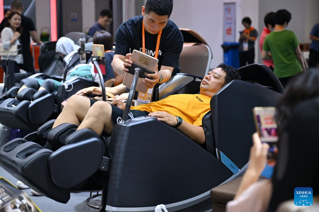 Visitors try OSIM massage chairs during the fourth China International Consumer Products Expo in Haikou, capital city of south China's Hainan Province, April 17, 2024. The fourth China International Consumer Products Expo, which lasts from April 13 to 18, is China's only national-level exhibition featuring consumer products and is also the largest consumer expo in the entire Asia-Pacific region. (Xinhua/Guo Cheng)