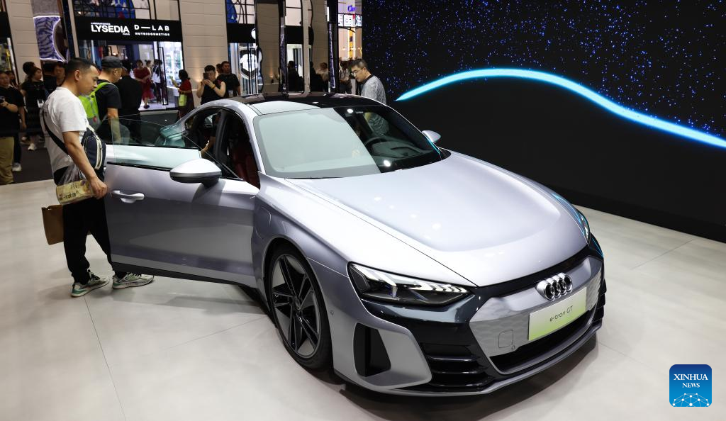 A visitor looks at an Audi vehicle during the fourth China International Consumer Products Expo in Haikou, capital city of south China's Hainan Province, April 17, 2024. The fourth China International Consumer Products Expo, which lasts from April 13 to 18, is China's only national-level exhibition featuring consumer products and is also the largest consumer expo in the entire Asia-Pacific region. (Xinhua/Yang Guanyu)