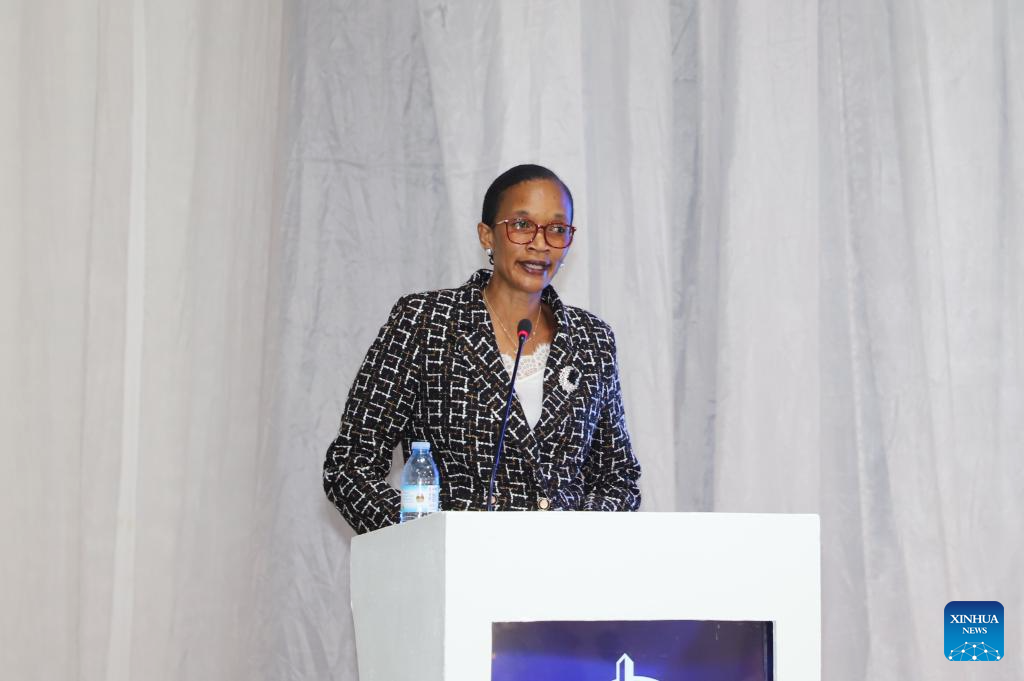 Esther Anyakun, Ugandan state minister for labor, employment and industrial relations, addresses the opening ceremony of the "Seagull Talent Training Project" in the central district of Wakiso, Uganda, April 16, 2024. China Communications Construction Corporation (CCCC) on Tuesday started a two-week training program for local foremen and engineers in Uganda's central district of Wakiso.