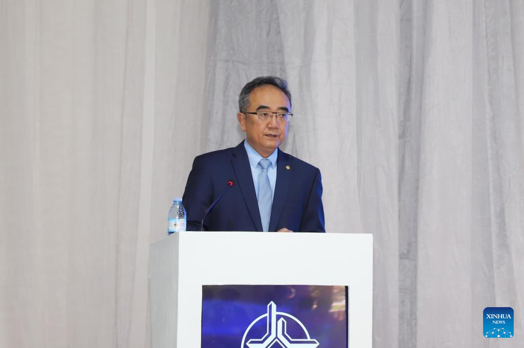 Zhao Wei, the China Communications Construction Corporation Uganda representative, addresses the opening ceremony of the "Seagull Talent Training Project" in the central district of Wakiso, Uganda, April 16, 2024. China Communications Construction Corporation (CCCC) on Tuesday started a two-week training program for local foremen and engineers in Uganda's central district of Wakiso.
