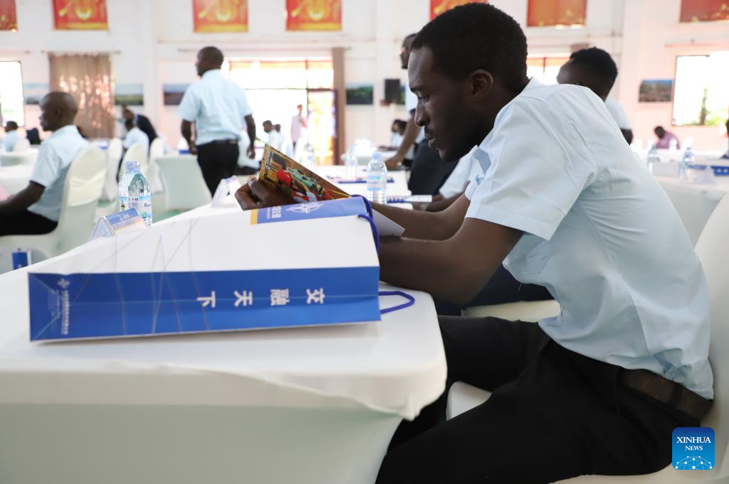 A trainee reads pamphlets about the "Seagull Talent Training Project" during the opening ceremony of the project at the central district of Wakiso, Uganda, April 16, 2024. China Communications Construction Corporation (CCCC) on Tuesday started a two-week training program for local foremen and engineers in Uganda's central district of Wakiso.