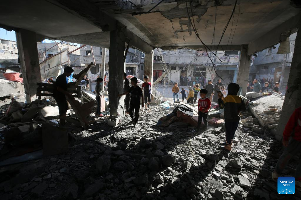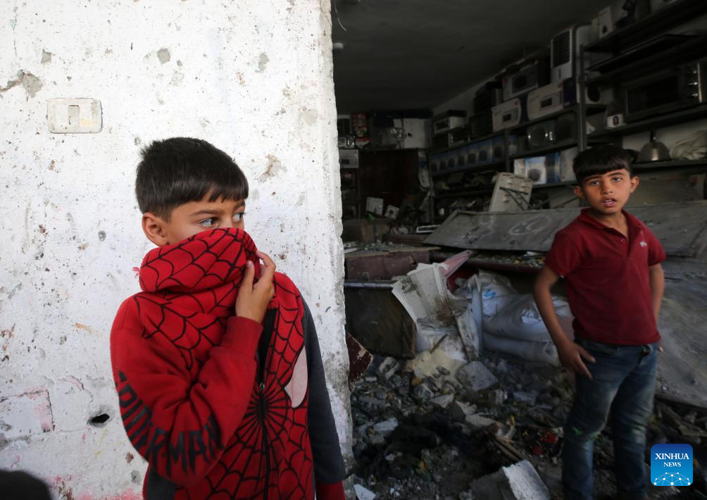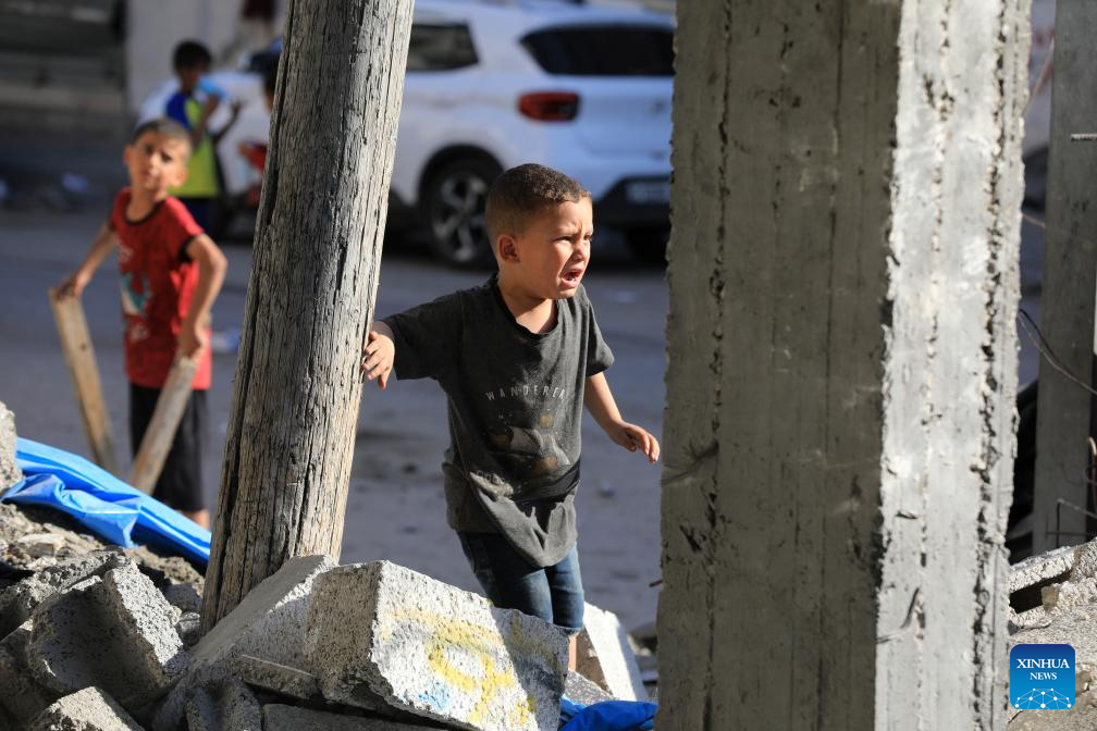 Palestinian children are seen near a destroyed house after an Israeli airstrike in the southern Gaza Strip city of Rafah, on April 17, 2024. The Palestinian death toll in the Gaza Strip from ongoing Israeli attacks has risen to 33,899, the Hamas-run Health Ministry said in a press statement on Wednesday. (Photo by Yasser Qudih/Xinhua)