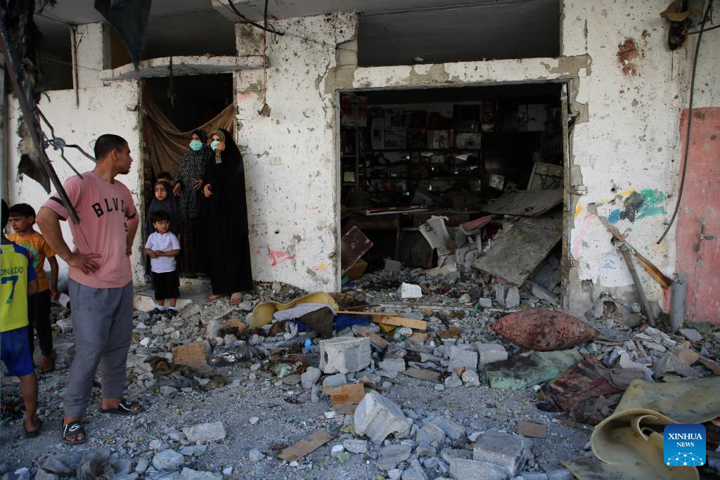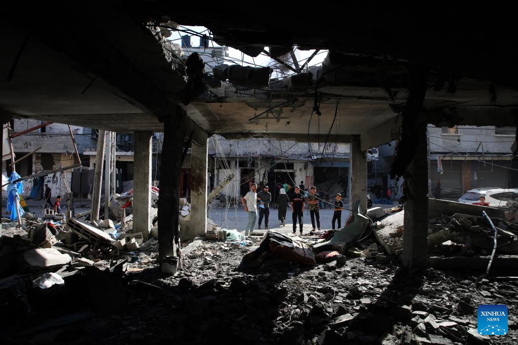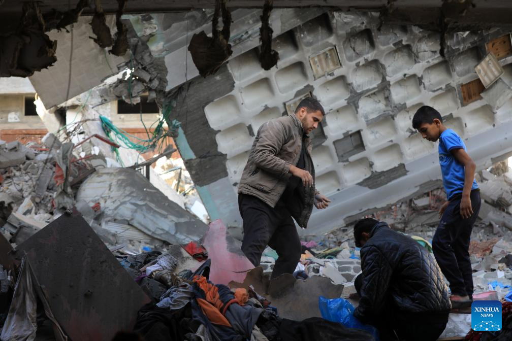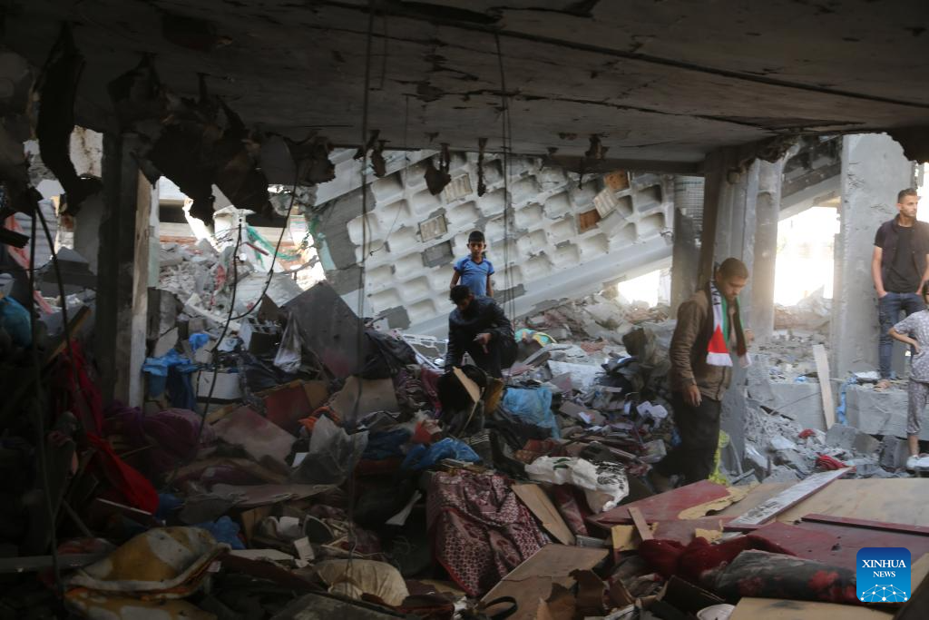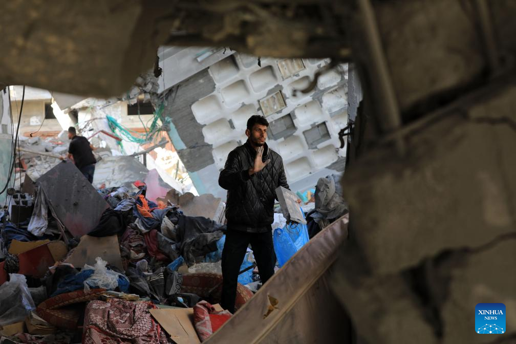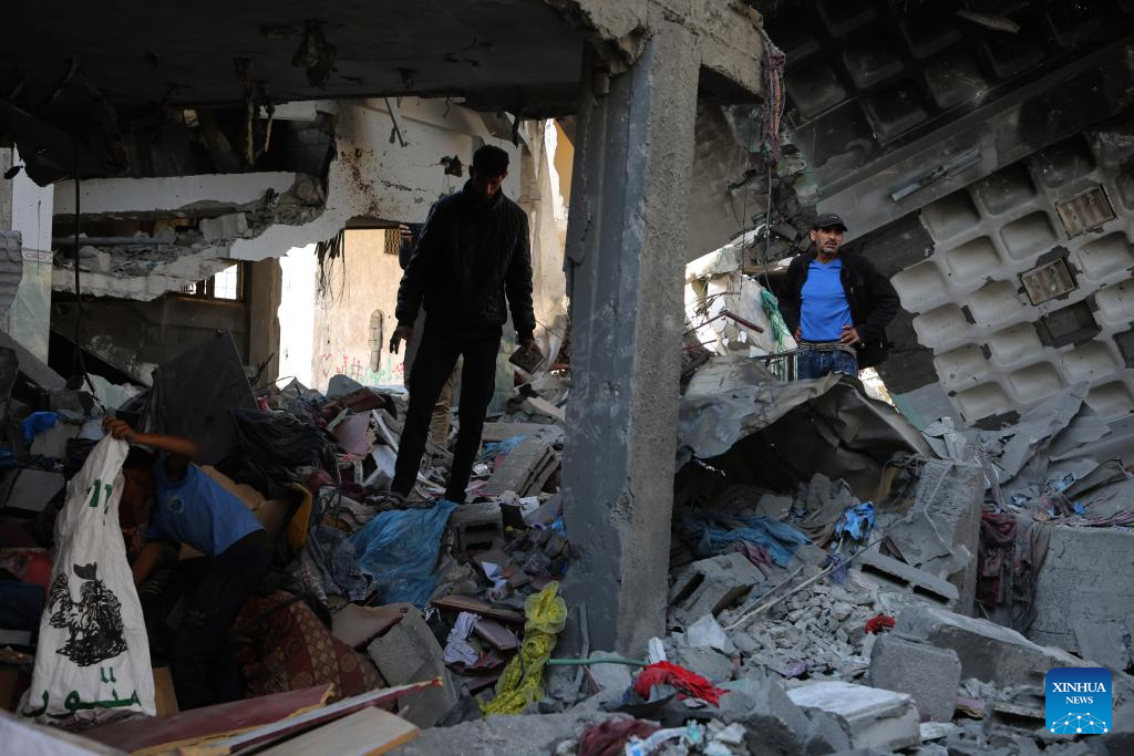 People inspect a destroyed house in the southern Gaza Strip city of Rafah, on April 17, 2024. The Palestinian death toll in the Gaza Strip from ongoing Israeli attacks has risen to 33,899, the Hamas-run Health Ministry said in a press statement on Wednesday. (Photo by Khaled Omar/Xinhua)