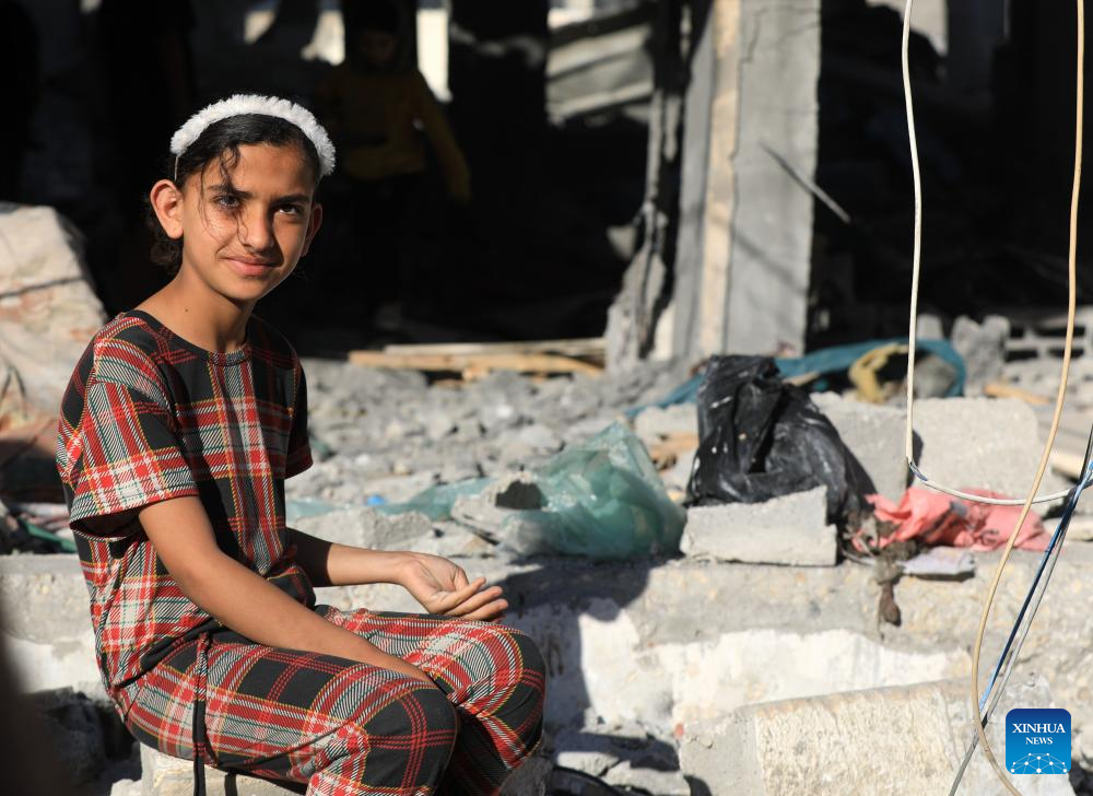 A Palestinian girl sits near a destroyed house after an Israeli airstrike in the southern Gaza Strip city of Rafah, on April 17, 2024. The Palestinian death toll in the Gaza Strip from ongoing Israeli attacks has risen to 33,899, the Hamas-run Health Ministry said in a press statement on Wednesday. (Photo by Yasser Qudih/Xinhua)