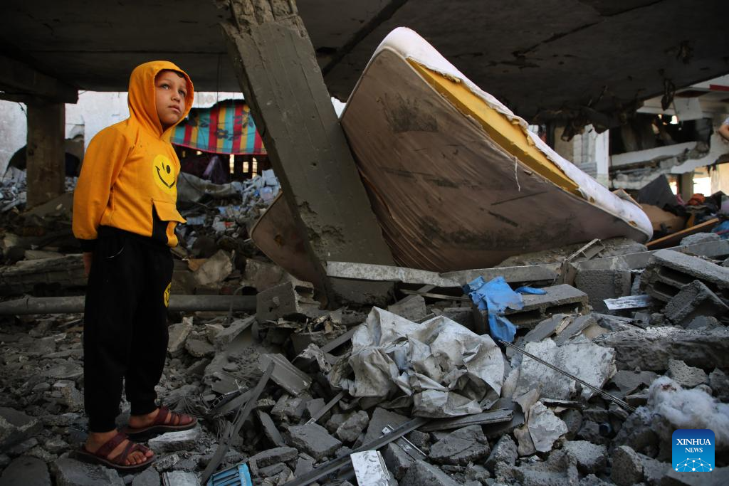 A boy stands among the rubble of a destroyed house in the southern Gaza Strip city of Rafah, on April 17, 2024. The Palestinian death toll in the Gaza Strip from ongoing Israeli attacks has risen to 33,899, the Hamas-run Health Ministry said in a press statement on Wednesday. (Photo by Khaled Omar/Xinhua)
