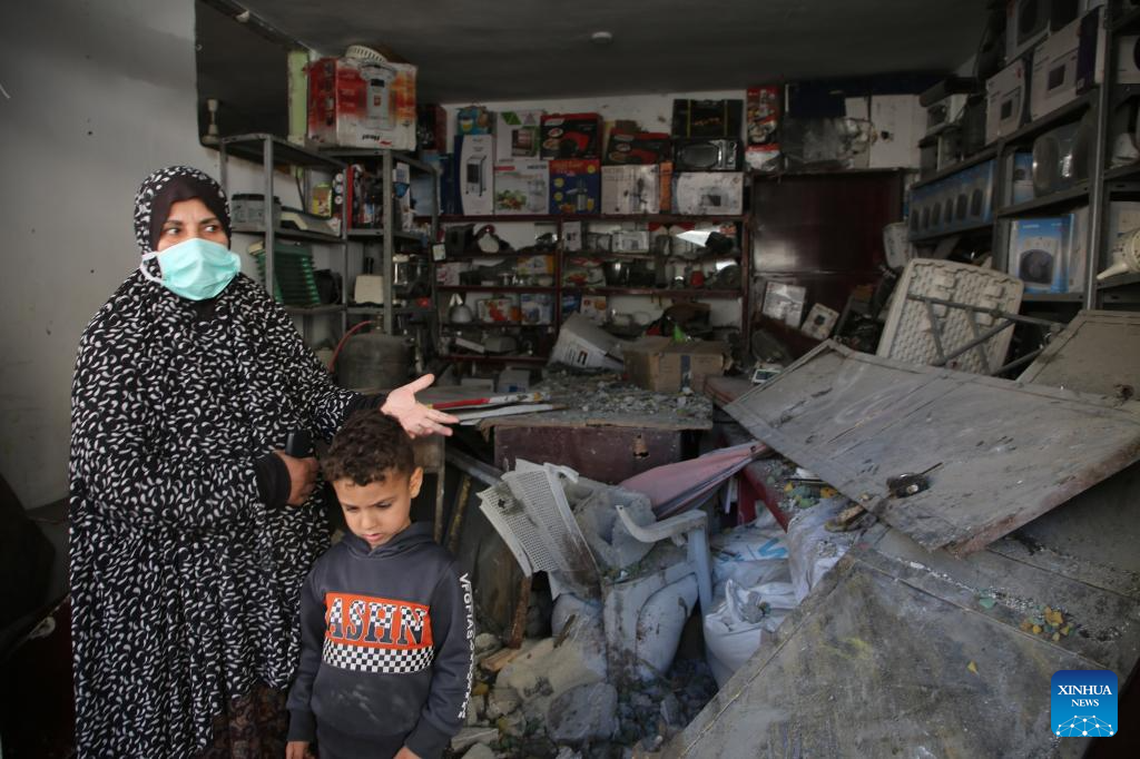 A woman shows the damage to a house in the southern Gaza Strip city of Rafah, on April 17, 2024. The Palestinian death toll in the Gaza Strip from ongoing Israeli attacks has risen to 33,899, the Hamas-run Health Ministry said in a press statement on Wednesday. (Photo by Khaled Omar/Xinhua)