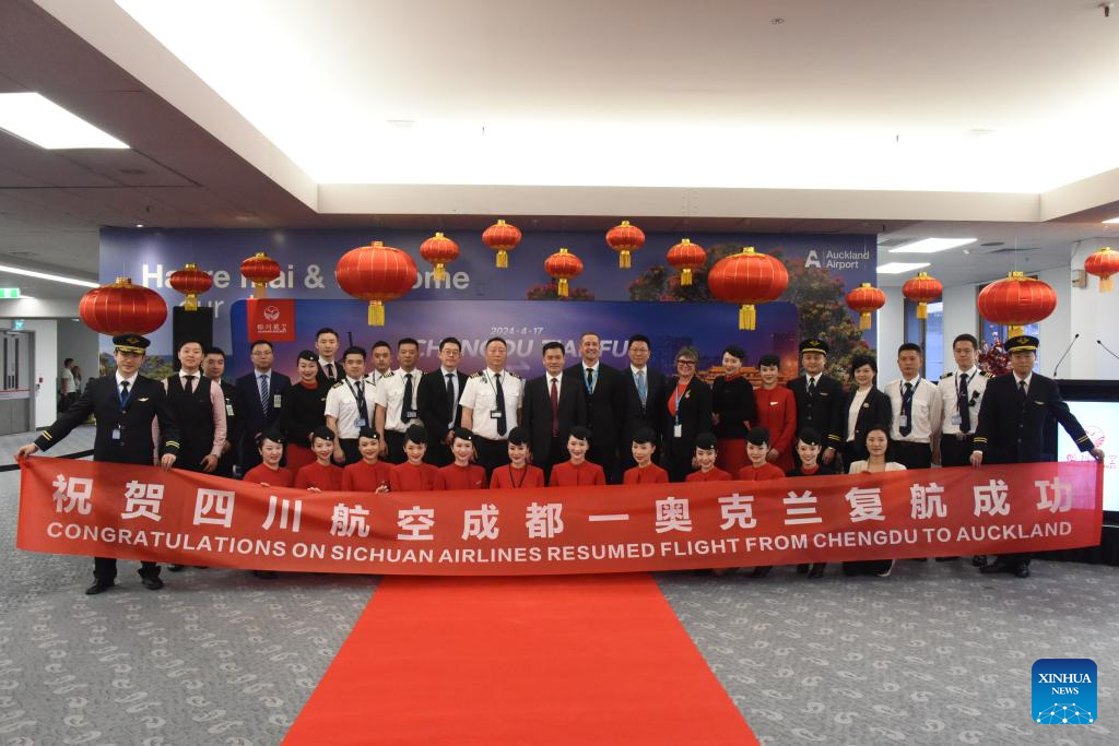 AUCKLAND, New Zealand, April 17 (Xinhua) -- The direct flights between China's Chengdu and Auckland of New Zealand officially resumed on Wednesday as a Sichuan Airlines' aircraft carrying over 200 Chinese tourists landed at the Auckland International Airport.