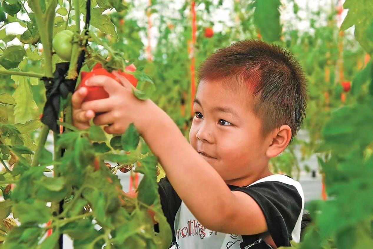 A boy picks space tomatoes in Maoxin village, Gulin township, Haishu district, Ningbo, east China's Zhejiang province. (Photo/Hu Xuejun)
