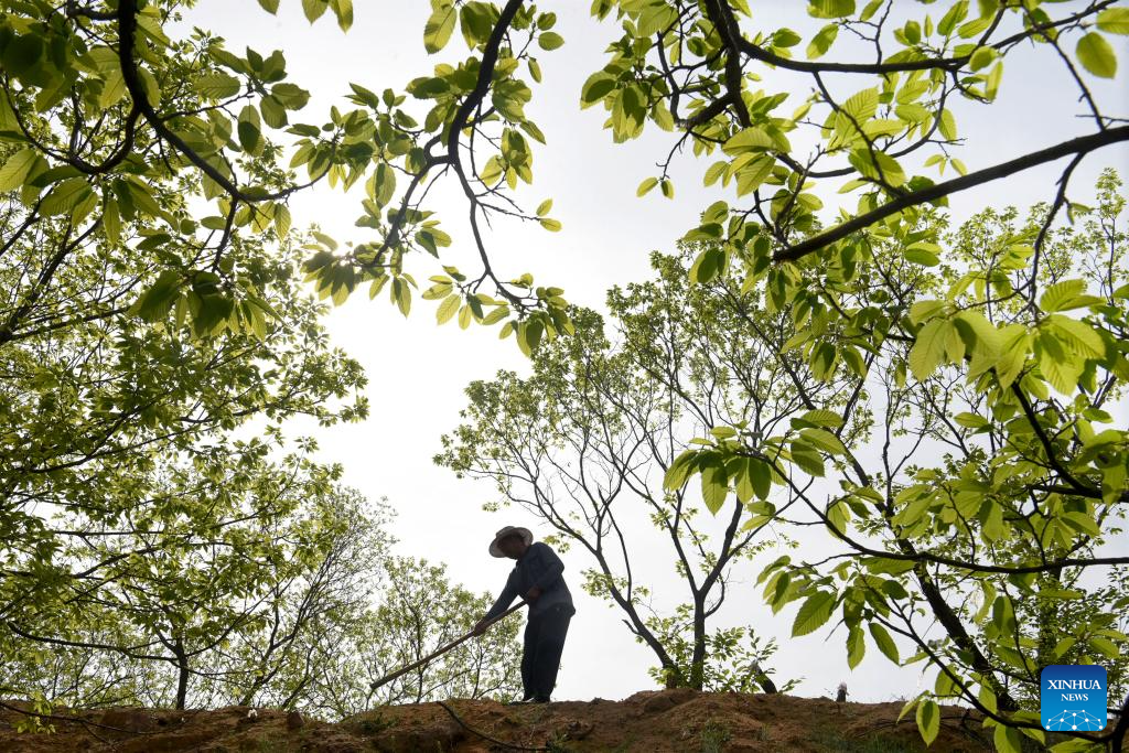 A farmer works in the field in Yuezhuang Township of Yiyuan County, Zibo City, east China's Shandong Province, April 19, 2024. Friday marks Guyu, or Grain Rain, which is the sixth of the 24 traditional Chinese solar terms, signifying the onset of the rainy season, a favorable time for planting and the growth of crops. (Photo by Zhao Dongshan/Xinhua)