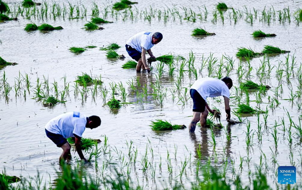 Farmers transplant rice seedlings in Tongtan Township of Luzhou City, southwest China's Sichuan Province, April 19, 2024. Friday marks Guyu, or Grain Rain, which is the sixth of the 24 traditional Chinese solar terms, signifying the onset of the rainy season, a favorable time for planting and the growth of crops. (Photo by Liu Xueyi/Xinhua)