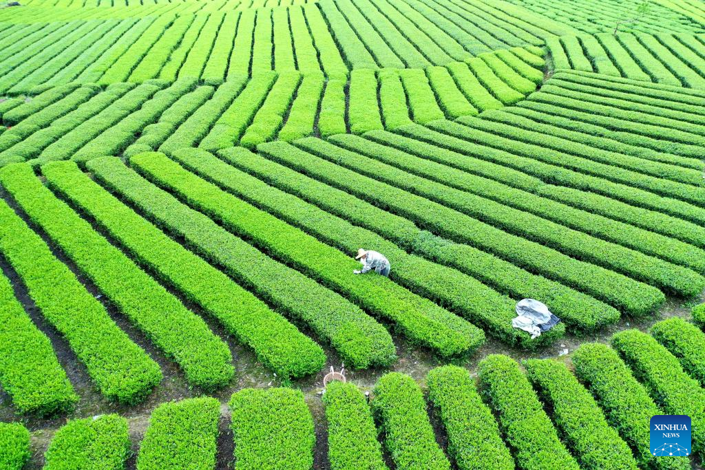An aerial drone photo taken on April 19, 2024 shows a farmer collecting tea leaves in a tea garden in Jiaoyuan Township of Xuanen County, central China's Hubei Province. Friday marks Guyu, or Grain Rain, which is the sixth of the 24 traditional Chinese solar terms, signifying the onset of the rainy season, a favorable time for planting and the growth of crops. (Photo by Song Wen/Xinhua)