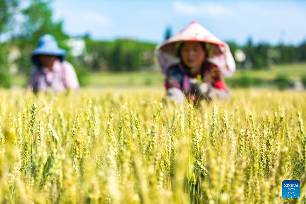 Farmers work in a wheat field in Xixiu District of Anshun City, southwest China's Guizhou Province, April 19, 2024. Friday marks Guyu, or Grain Rain, which is the sixth of the 24 traditional Chinese solar terms, signifying the onset of the rainy season, a favorable time for planting and the growth of crops. (Photo by Chen Xi/Xinhua)