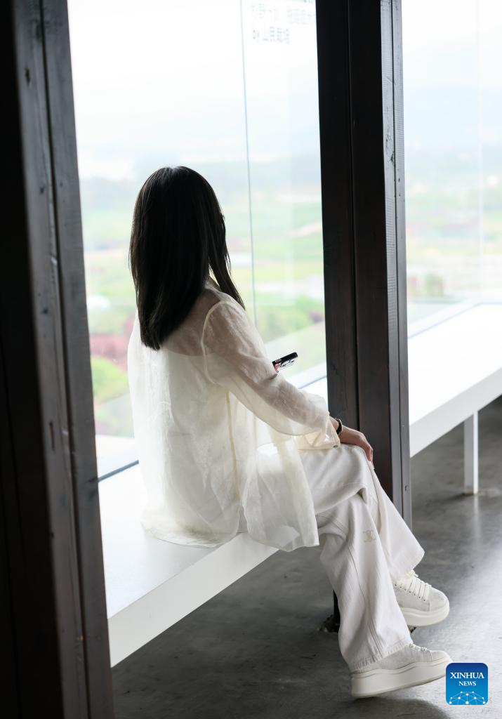 A visitor takes a rest at Mountopia tea &coffee shop in Liangnong Township of Yuyao City, east China's Zhejiang Province, April 13, 2024. (Xinhua/Lan Hongguang)