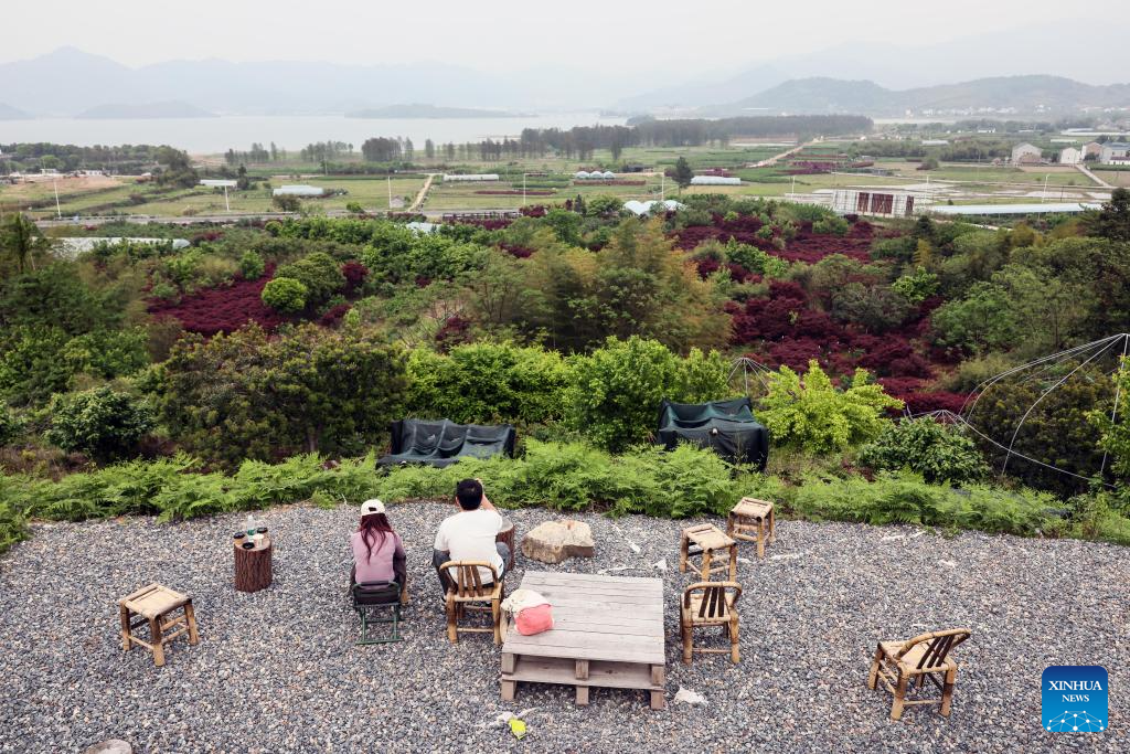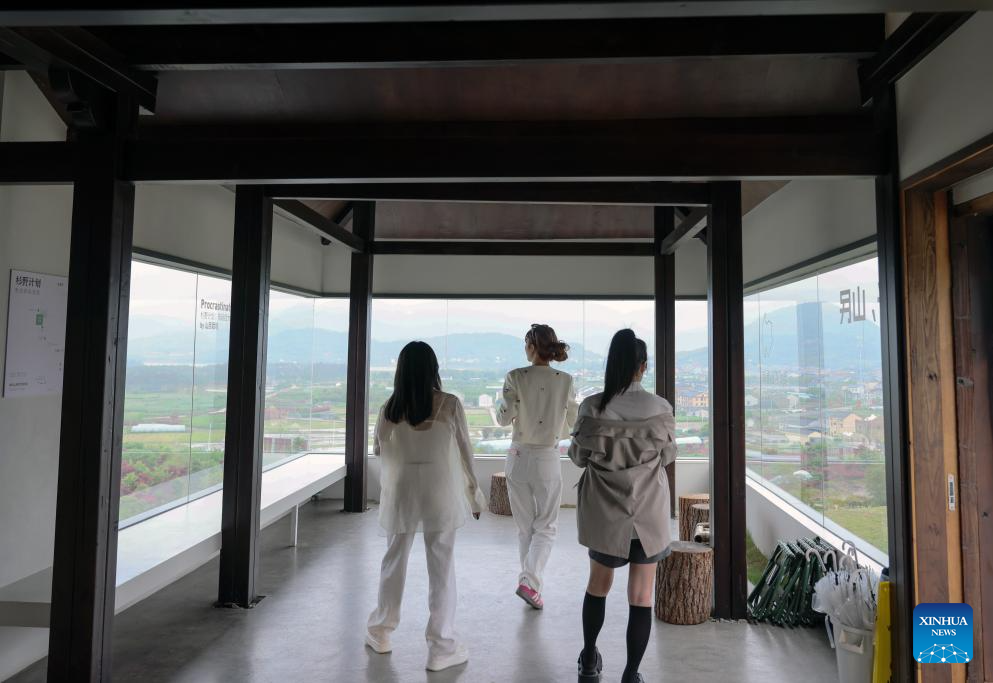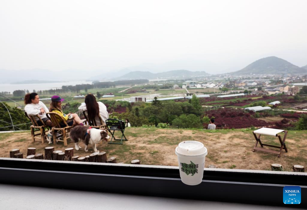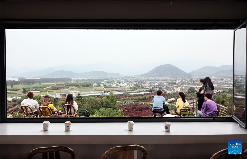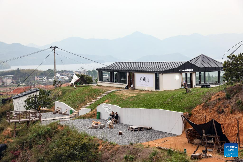 Visitors enjoy scenery at Mountopia tea &coffee shop in Liangnong Township of Yuyao City, east China's Zhejiang Province, April 13, 2024. (Xinhua/Lan Hongguang)
