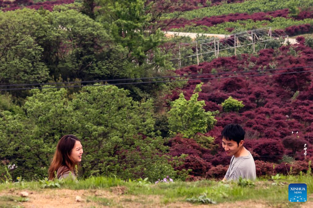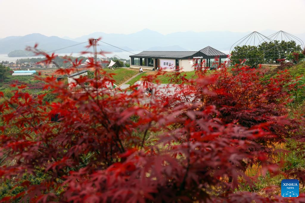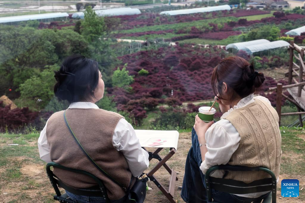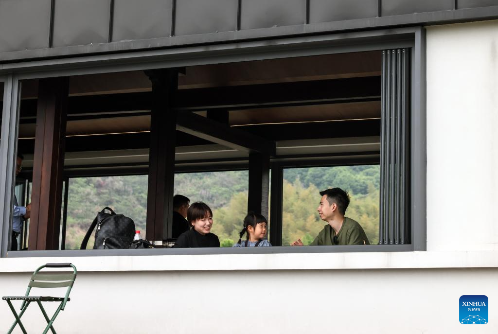 Visitors enjoy scenery at Mountopia tea &coffee shop in Liangnong Township of Yuyao City, east China's Zhejiang Province, April 13, 2024. (Xinhua/Lan Hongguang)