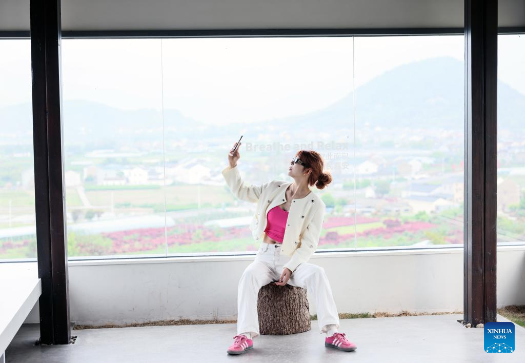 A visitor takes a selfie at Mountopia tea &coffee shop in Liangnong Township of Yuyao City, east China's Zhejiang Province, April 13, 2024. (Xinhua/Lan Hongguang)