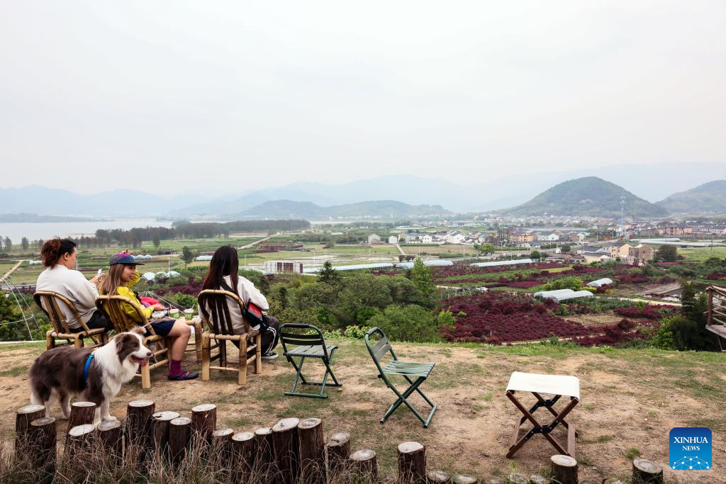 Visitors take a rest at the outdoor area of Mountopia tea &coffee shop, with the Siming Lake in the distance in Liangnong Township of Yuyao City, east China's Zhejiang Province, April 13, 2024. (Xinhua/Lan Hongguang)