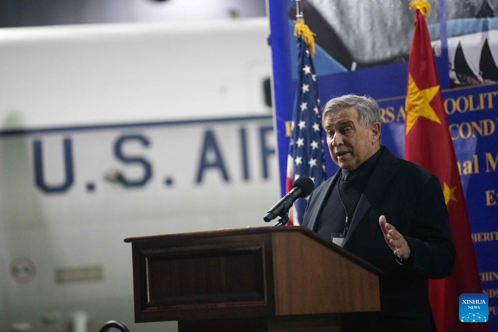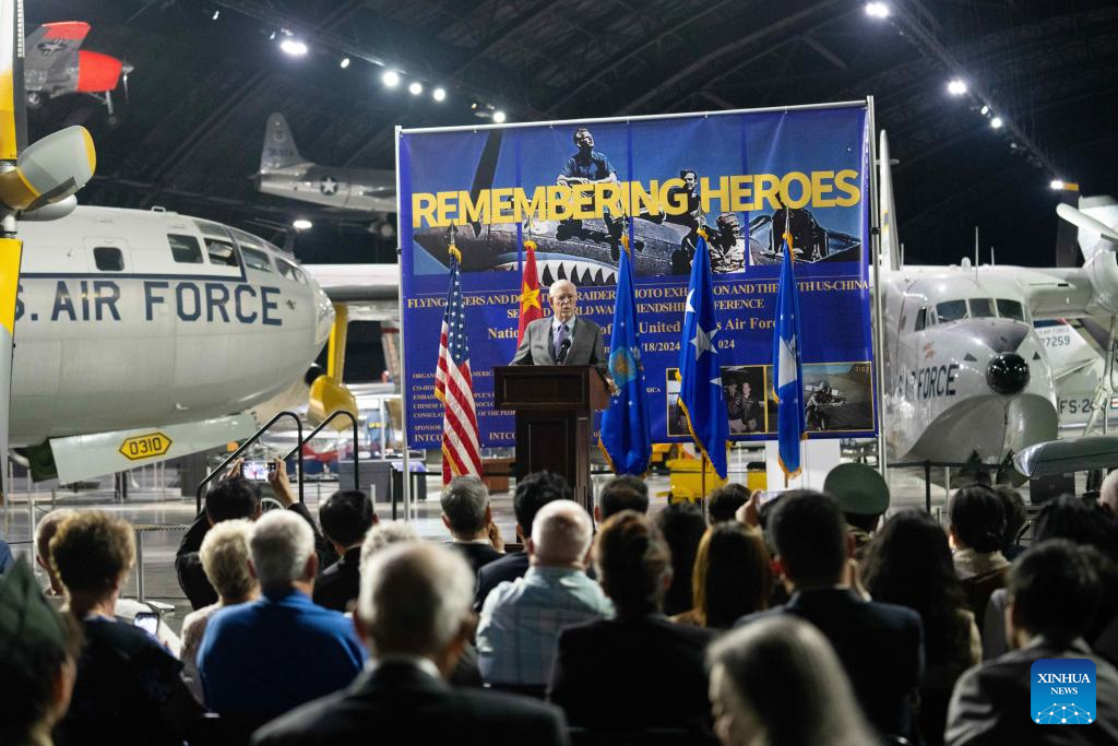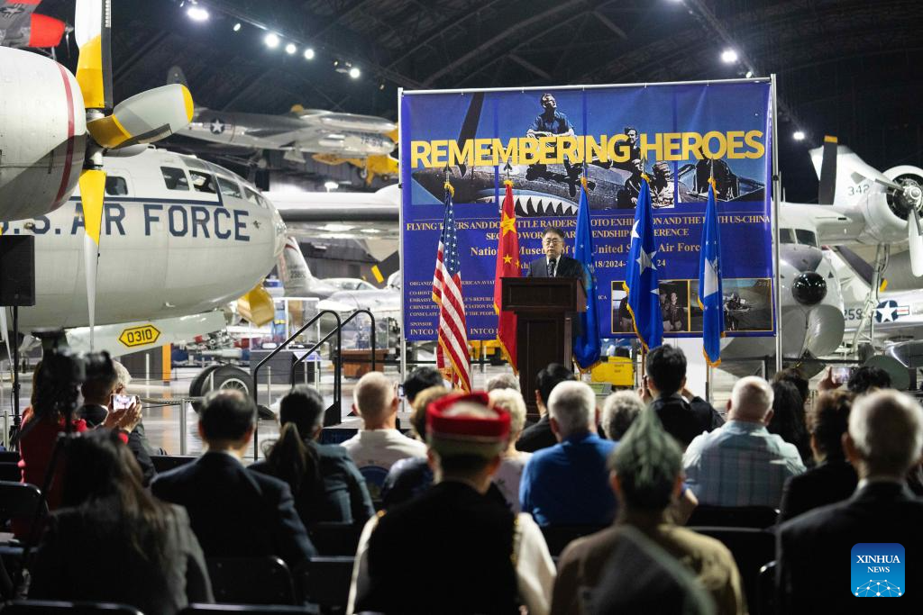 The Chinese Consul General in New York Huang Ping speaks during a photo exhibition commemorating the Flying Tigers and Doolittle Raiders, Americans who fought Japan in World War II in cooperation with the Chinese people, at the National Museum of the U.S. Air Force in Dayton, Ohio, the United States, April 18, 2024. The half-year-long exhibition recounts the stories of the Flying Tigers and Doolittle Raiders with around 100 photos and detailed narrations. (Xinhua/Liu Jie)