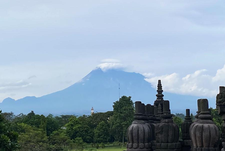 This photo taken on Feb. 4, 2023 shows a view of the Prambanan temple with the Mount Merapi in the background in Central Java, Indonesia. (Xinhua/Xu Qin)