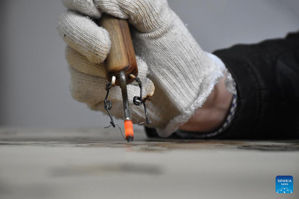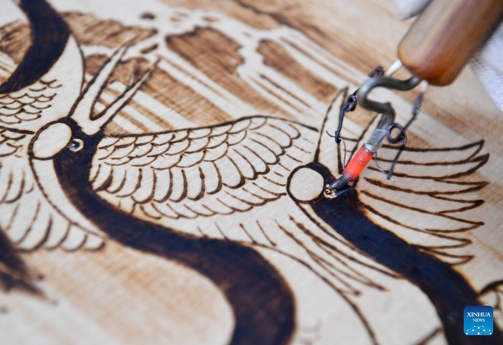A lover of Nanyang pyrography makes an artwork of pyrography at a training class of Nanyang Pyrography Factory in Nanyang City, central China's Henan Province, March 14, 2024. (Xinhua/Hao Yuan)