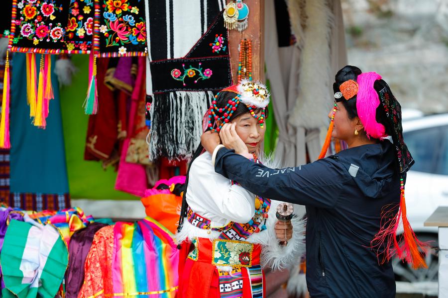 A tourist adjusts Tibetan attire before a photo session at a hamlet in Danba County, Tibetan Autonomous Prefecture of Garze, southwest China's Sichuan Province, March 23, 2024. (Xinhua/Shen Bohan)