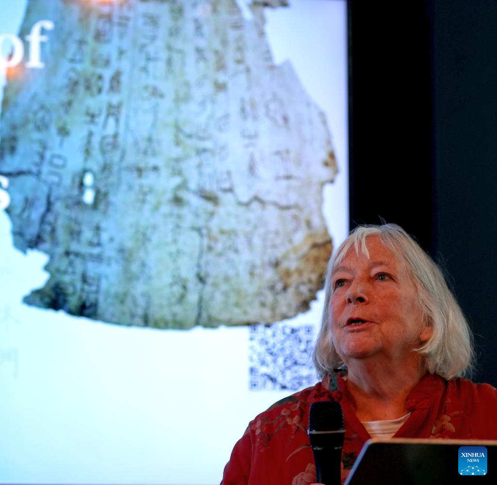 British sinologist Frances Wood speaks at an event named "Evolution of Chinese Characters" in London, Britain, April 20, 2024. A special exhibition of Chinese characters was launched here on Saturday to celebrate the Chinese Language Day of the United Nations (UN).(Xinhua/Li Ying)
