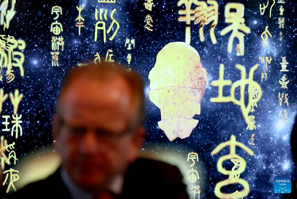 A man attends an event named "Evolution of Chinese Characters" in London, Britain, April 20, 2024. A special exhibition of Chinese characters was launched here on Saturday to celebrate the Chinese Language Day of the United Nations (UN). (Xinhua/Li Ying)