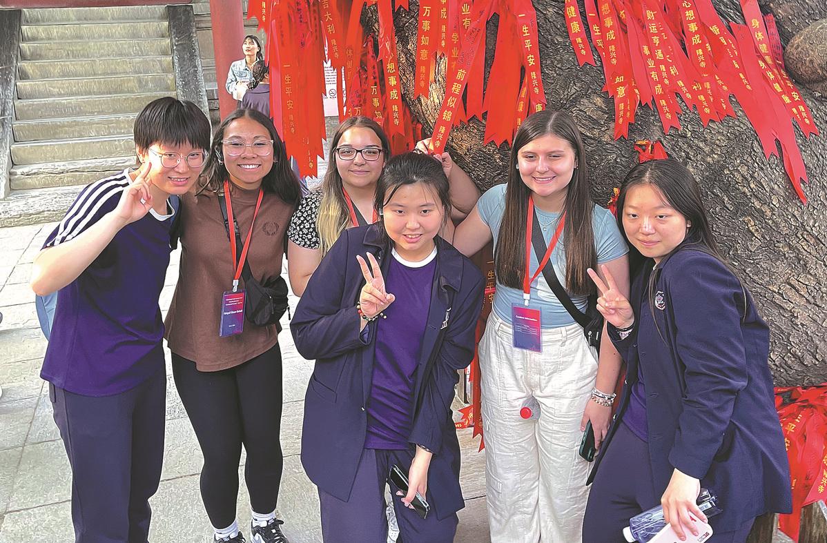 Students from Muscatine High School and Shijiazhuang Foreign Language School pose on Saturday under a tree with red ribbons bearing auspicious phrases at Longxing Temple in Zhengding county, Hebei province. ZHANG YUNBI/CHINA DAILY