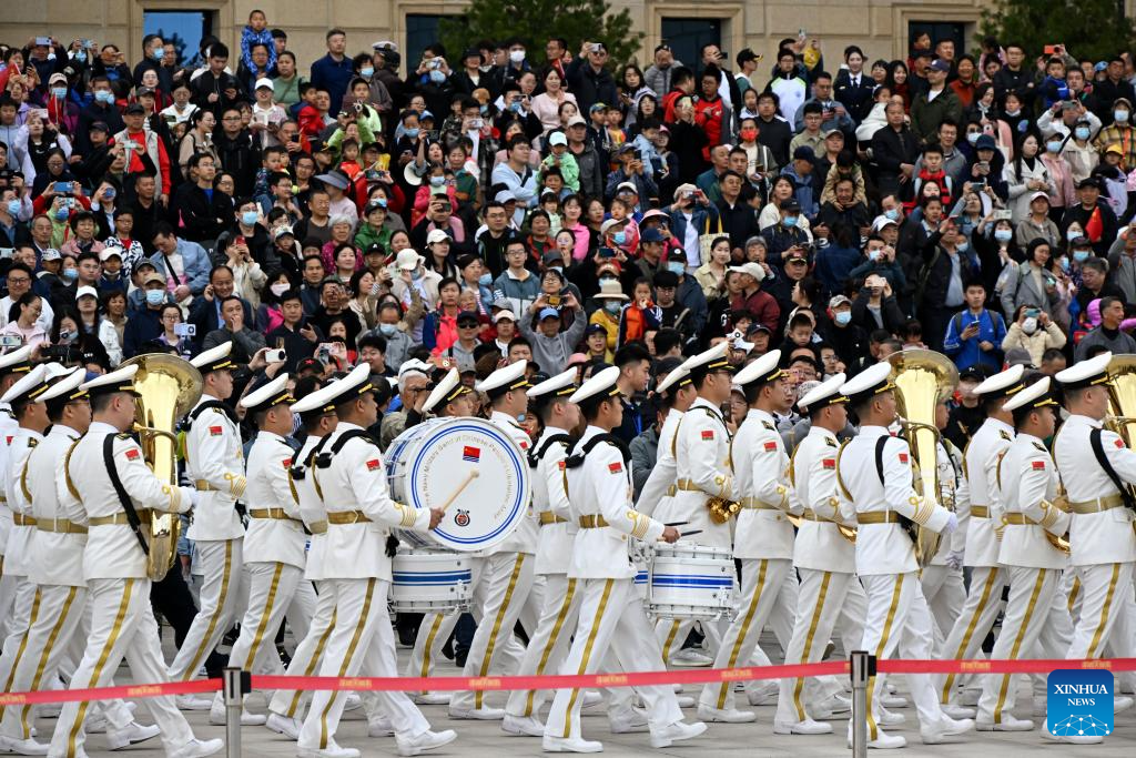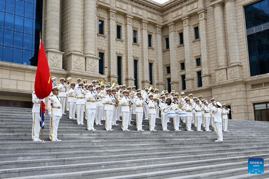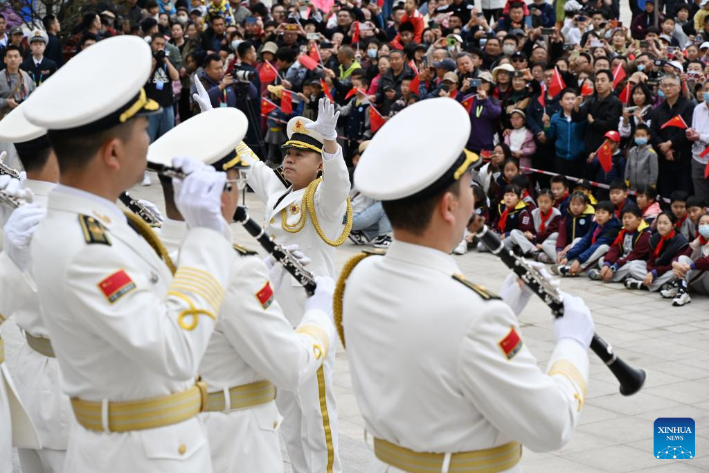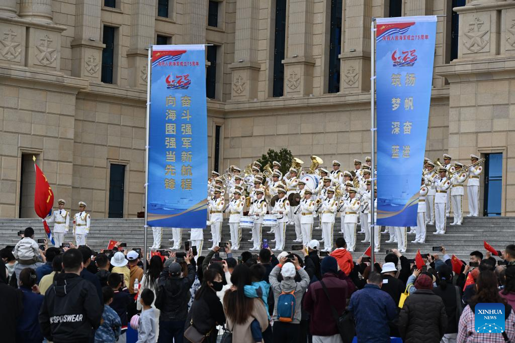 A military band performs at the Chinese People's Liberation Army (PLA) Navy Museum to celebrate the 75th founding anniversary of the Chinese PLA Navy in Qingdao, east China's Shandong Province, April 20, 2024. (Xinhua/Li Ziheng)