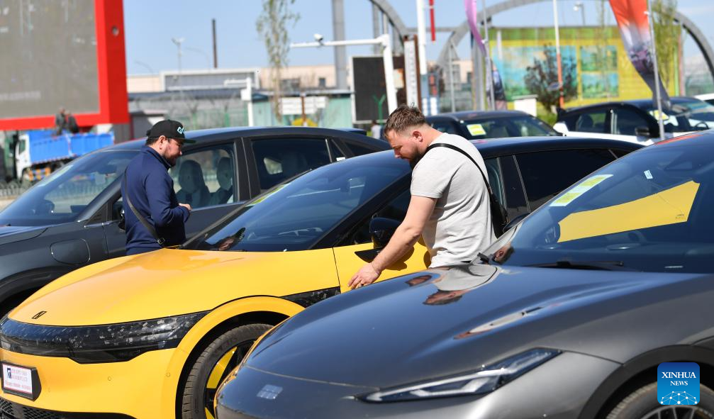 Foreign travelers view the cars on display at the Horgos International Border Cooperation Center on the China-Kazakhstan border in Horgos, northwest China's Xinjiang Uygur Autonomous Region, April 19, 2024. According to the statistics of the Horgos entry-exit border checkpoint, a total of over 1.34 million people have checked in and out of the center this year as of April 19. (Xinhua/Zhao Ge)
