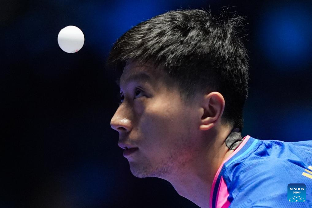 Ma Long of China hits a return during the men's singles final match against his teammate Lin Gaoyuan at the ITTF World Cup Macao 2024 at Galaxy Arena in Macao, China, April 21, 2024. (Xinhua/Wang Shen)