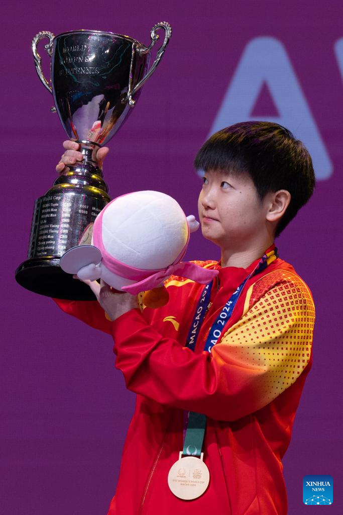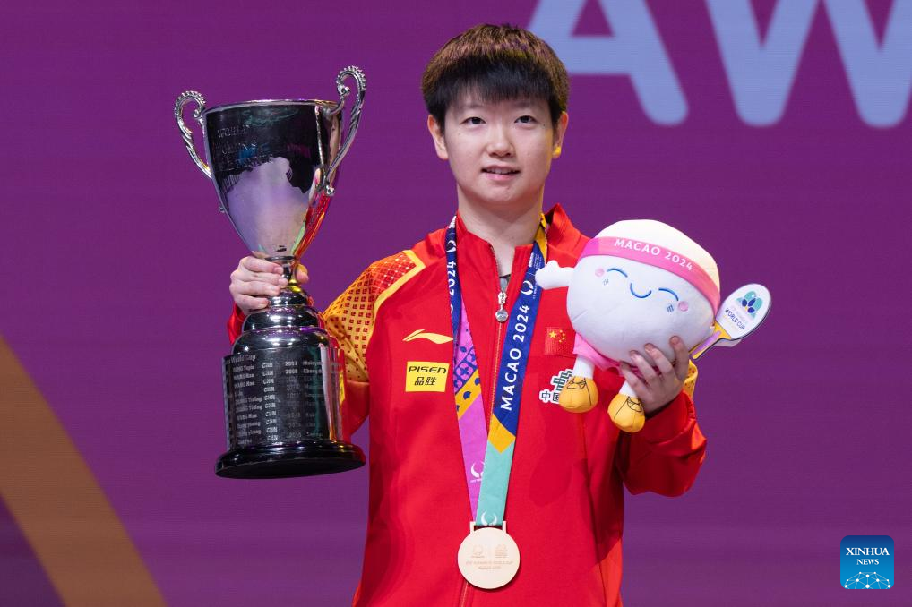 Women's singles event winner China's Sun Yingsha poses during the awarding ceremony of the ITTF World Cup Macao 2024 at Galaxy Arena in Macao, China, April 21, 2024. (Xinhua/Cheong Kam Ka)