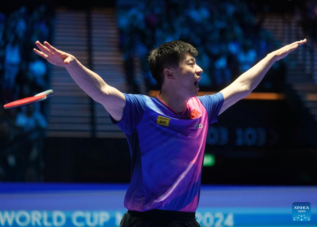 Ma Long of China celebrates after winning the men's singles final match against his teammate Lin Gaoyuan at the ITTF World Cup Macao 2024 at Galaxy Arena in Macao, China, April 21, 2024. (Xinhua/Wang Shen)
