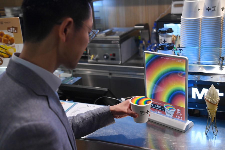 Photo taken on April 8, 2024 shows rainbow-striped coffee at a coffee shop at M+ Museum in West Kowloon Cultural District in south China's Hong Kong. (Xinhua/Chen Duo)