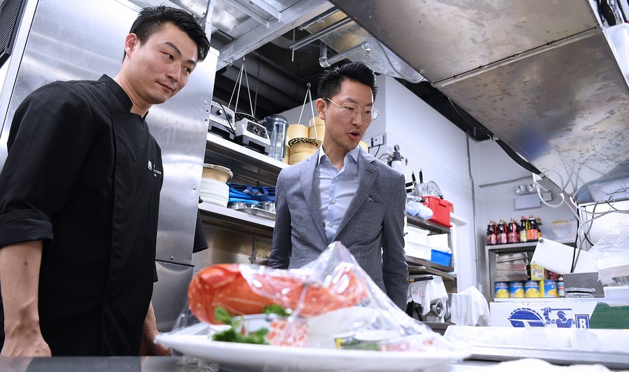 Photo taken on April 8, 2024 shows Vincent Wu checking the kitchen of the CVIEW restaurant at M+ Museum in West Kowloon Cultural District in south China's Hong Kong. (Xinhua/Chen Duo)
