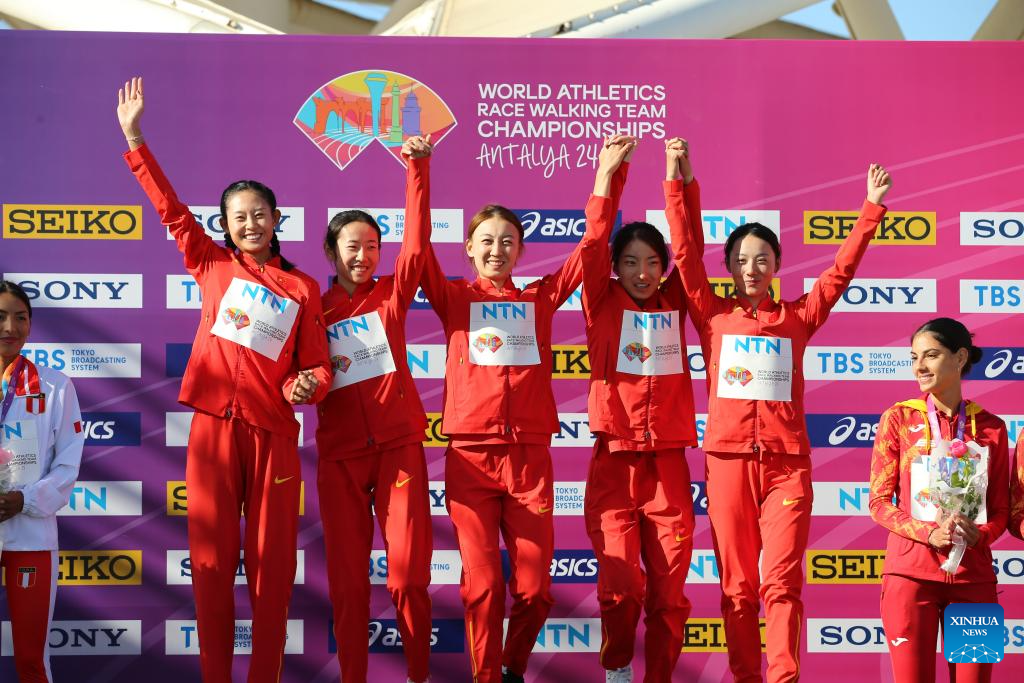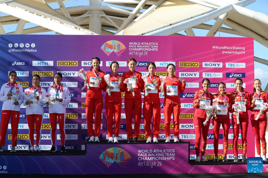 Team China (C) pose for photos during the awarding ceremony for women's team 20km race walk at the 2024 World Athletics Race Walking Team Championships in Antalya, Türkiye, April 21, 2024. (Mustafa Kaya/Handout via Xinhua)