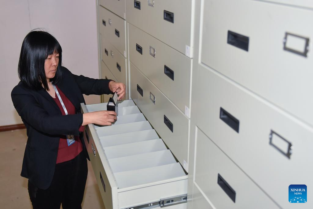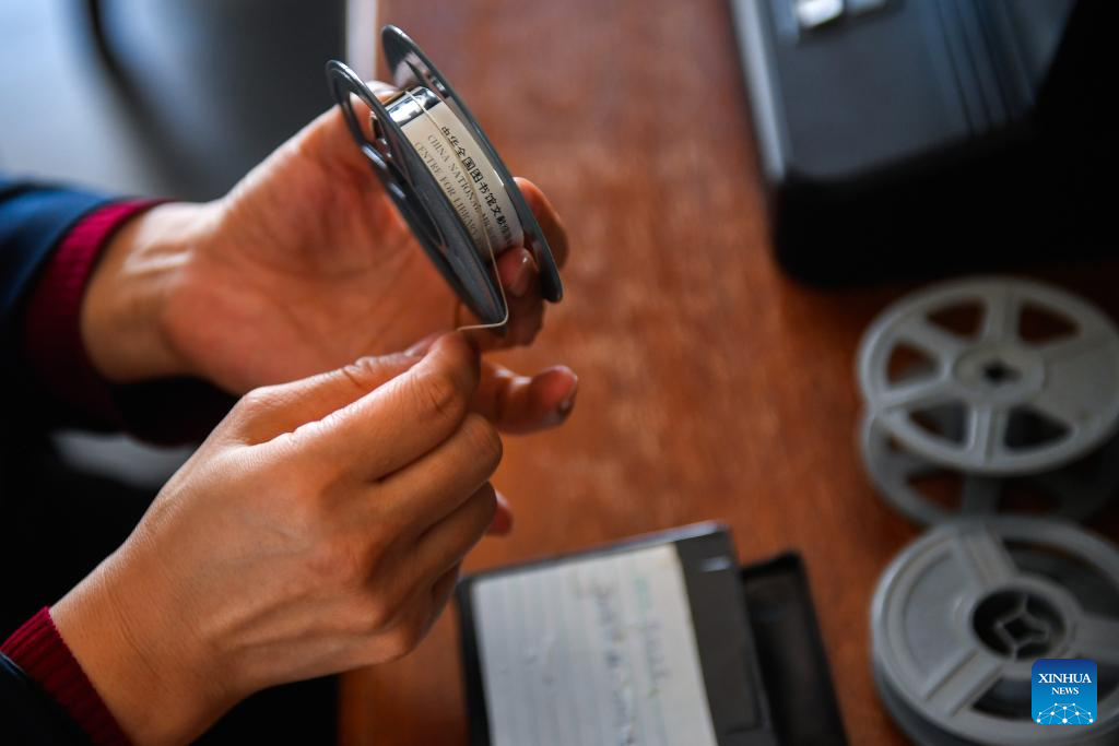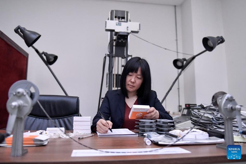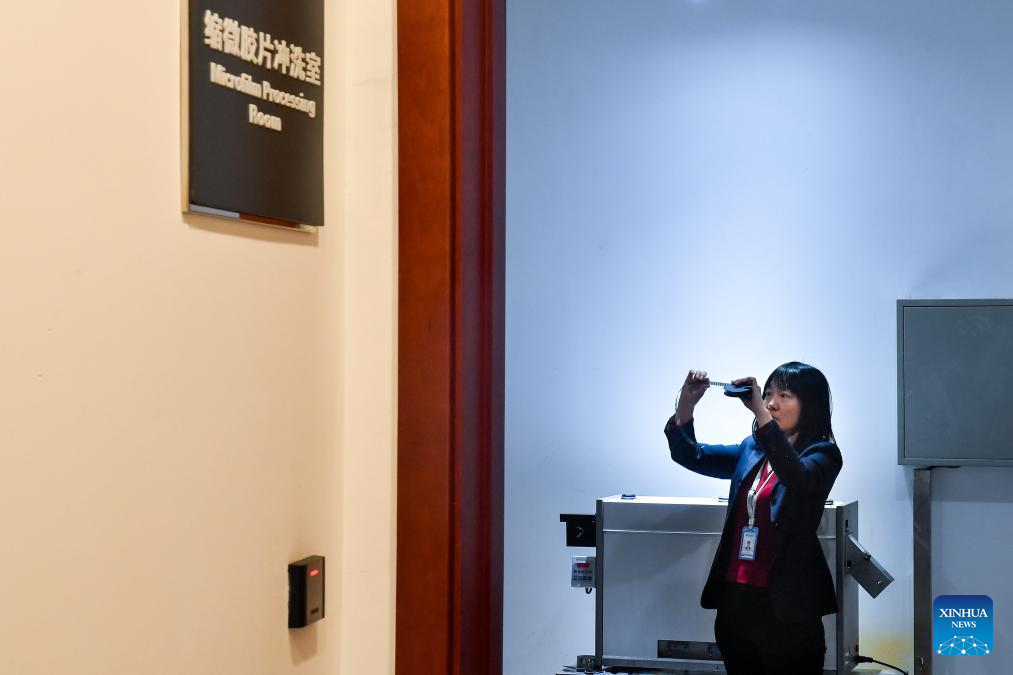 Zheng Shanji prepares to archive microfilm at Jilin Provincial Library in Changchun, northeast China's Jilin Province, April 22, 2024. (Xinhua/Xu Chang)