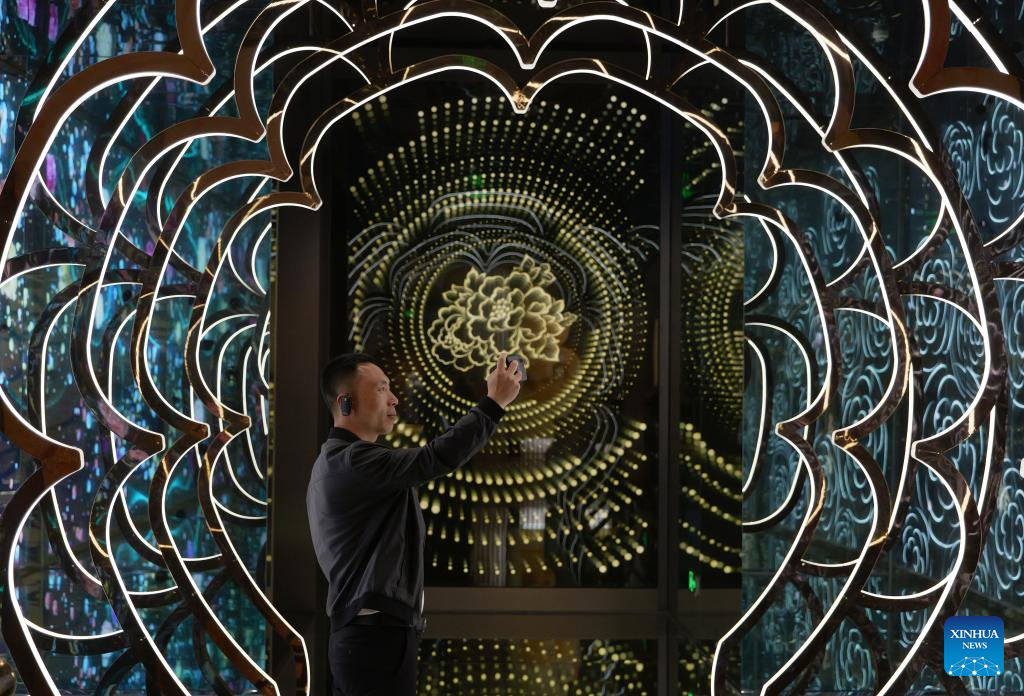 This photo taken on April 16, 2024 shows a peony-themed glazed wall at Peony Pavilion in Luoyang, central China's Henan Province. As an imperial capital during 13 dynasties, Luoyang claims to have the country's best peonies. In recent years, Luoyang has actively explored the culture related to peony flowers, encouraging the development of peony-themed porcelain, painting, and many other characteristic activities containing peony elements. This enables tourists to enjoy both the flowers and the vibe of this ancient capital. (Xinhua/Li An)